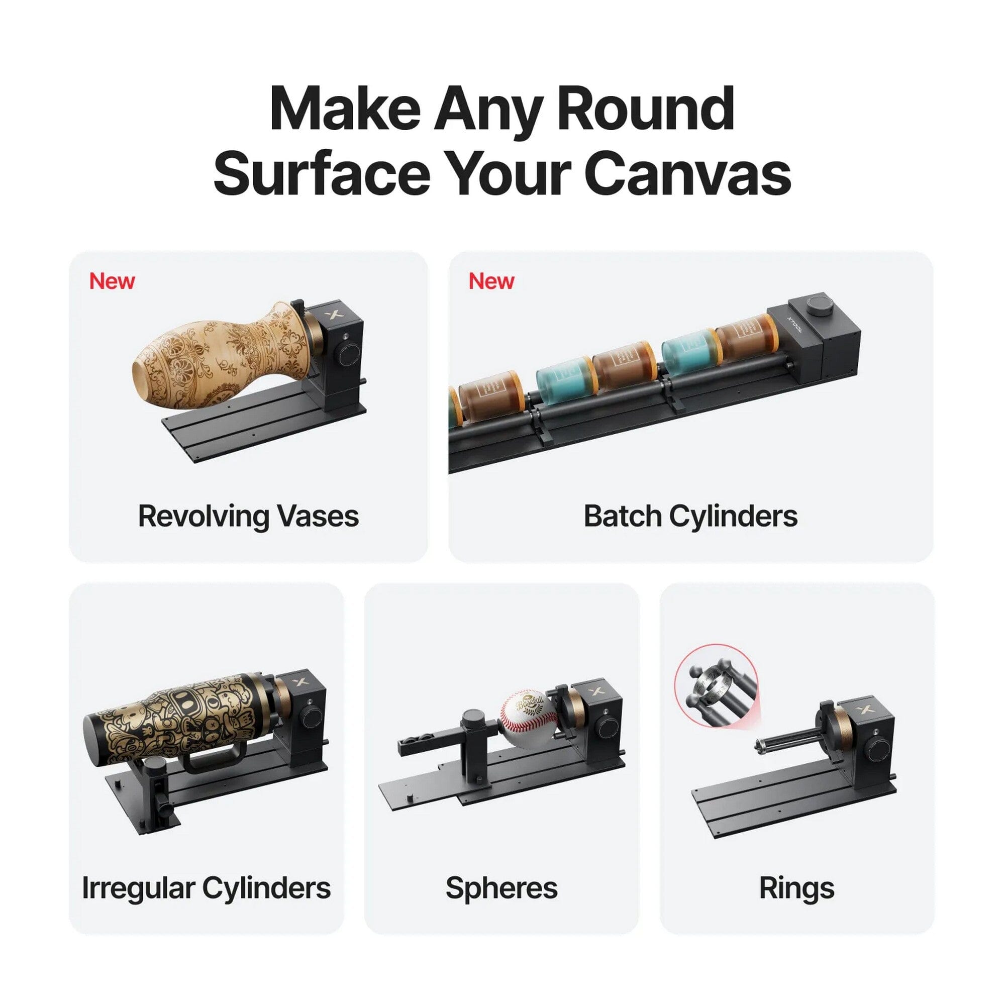 Rotary Engraving - Compatible with RA3 Pro, the 5-in-1 rotary attachment. xTool P2S unleashes your creativity on tumblers, mugs, spheres and rings.