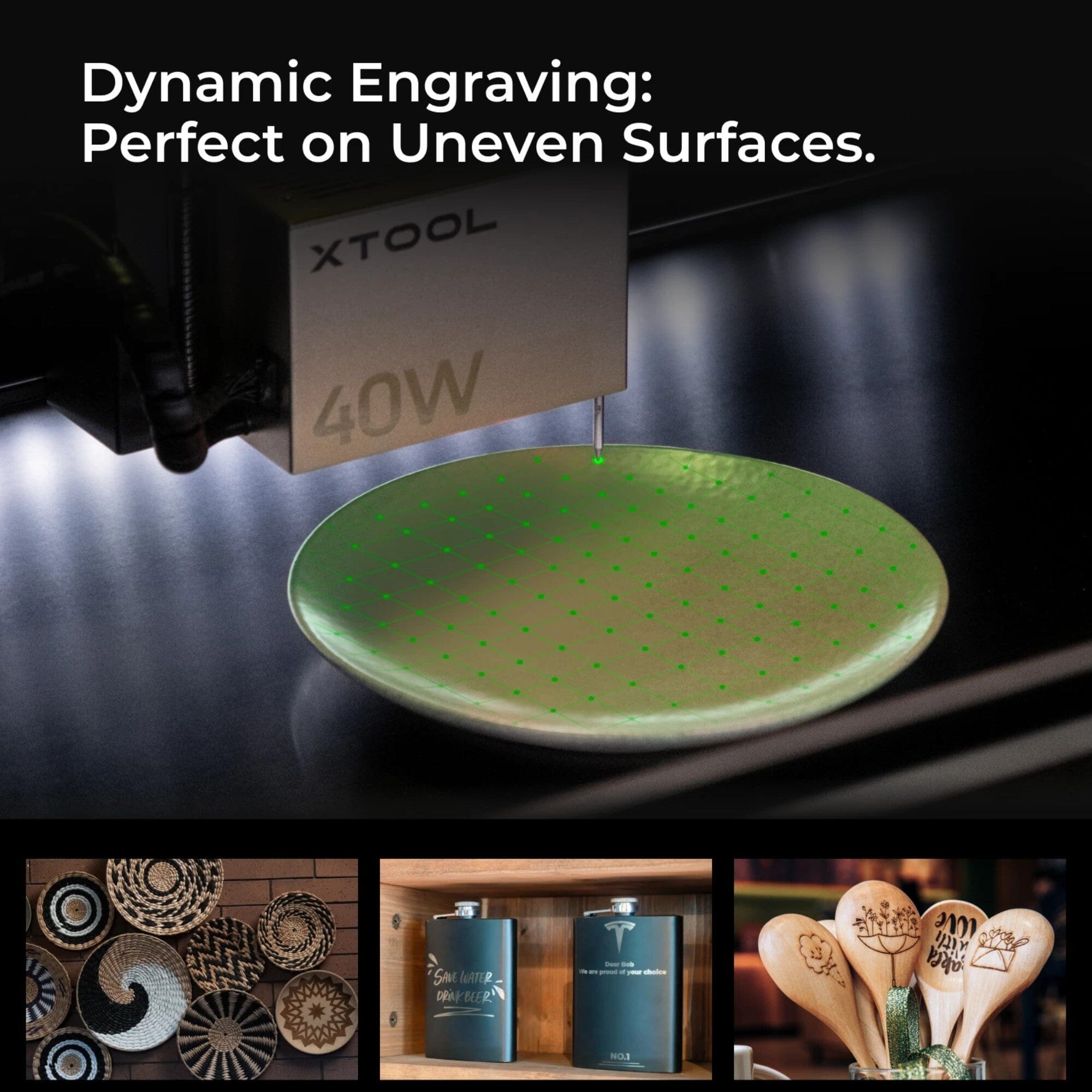 Dynamic-focus engraving: perfect on uneven surfaces - xTool S1 boasts a cutting-edge intelligent focusing system for multi-point focus ranging and 3D object automation. Its electric Z-axis dynamically refines focus, delivering a perfect engraving effect like a plane